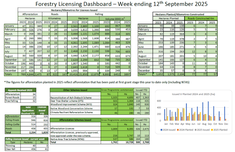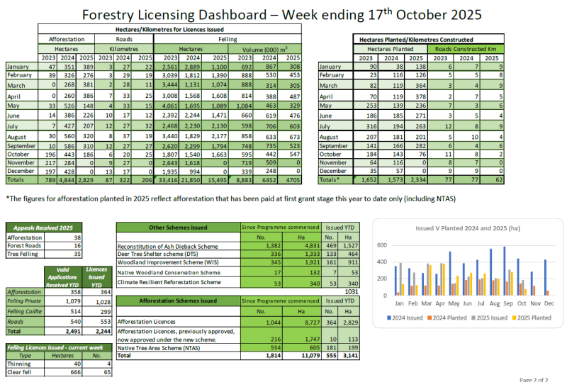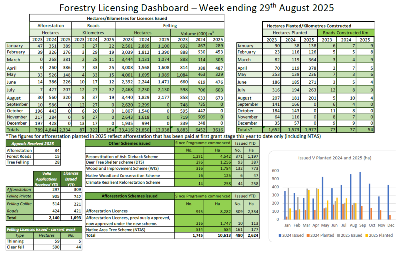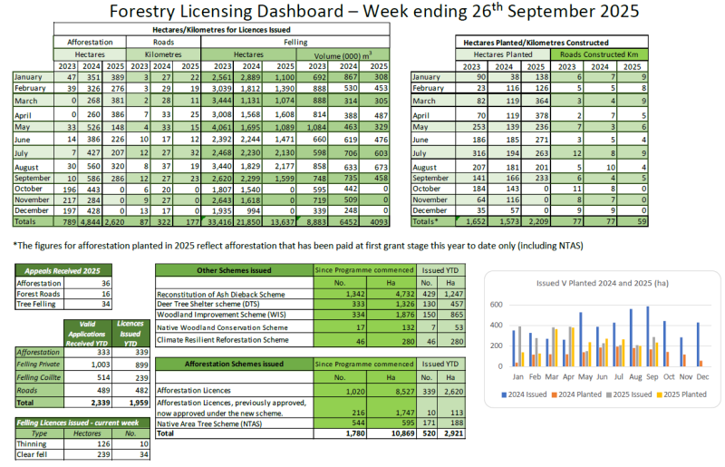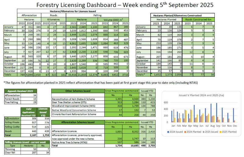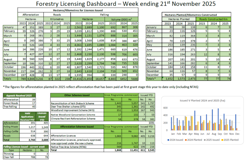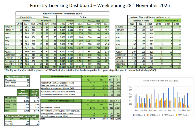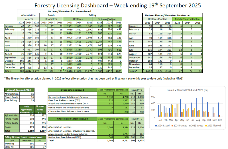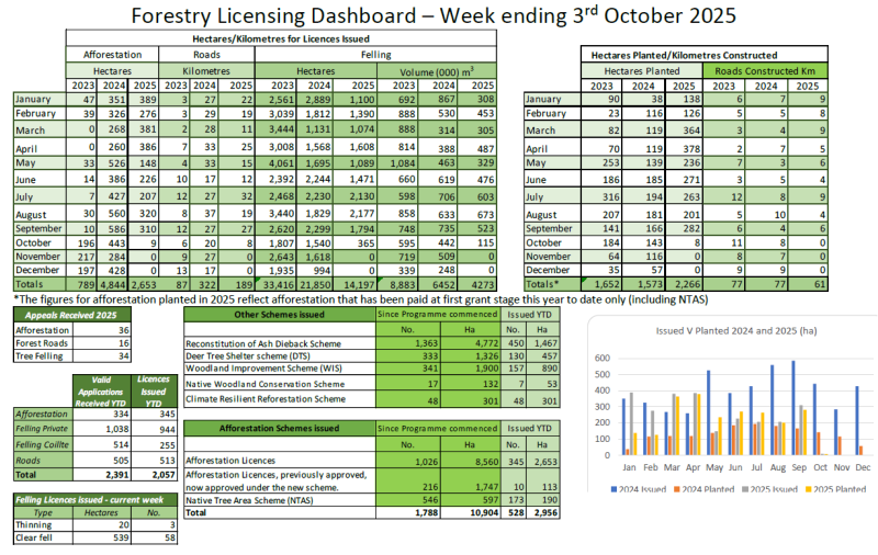 The Forestry Weekly licencing dashboard shows the details of all forestry licences issued by category on the Department of Agriculture, Food and the Marine website. It is published on the Departmental website and is made available to all interested parties, as well as being submitted to the Joint Committee on Agriculture, Food and the Marine each week.