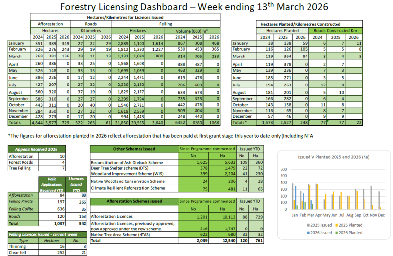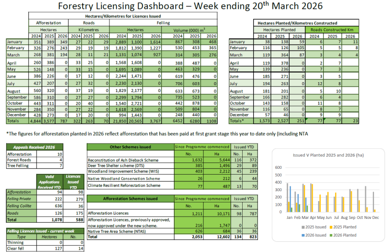 The Forestry Weekly licencing dashboard 2026 shows the details of all forestry licences issued by category on the Department of Agriculture, Food and the Marine website. It is published on the Departmental website and is made available to all interested parties, as well as being submitted to the Joint Committee on Agriculture, Food and the Marine each week.