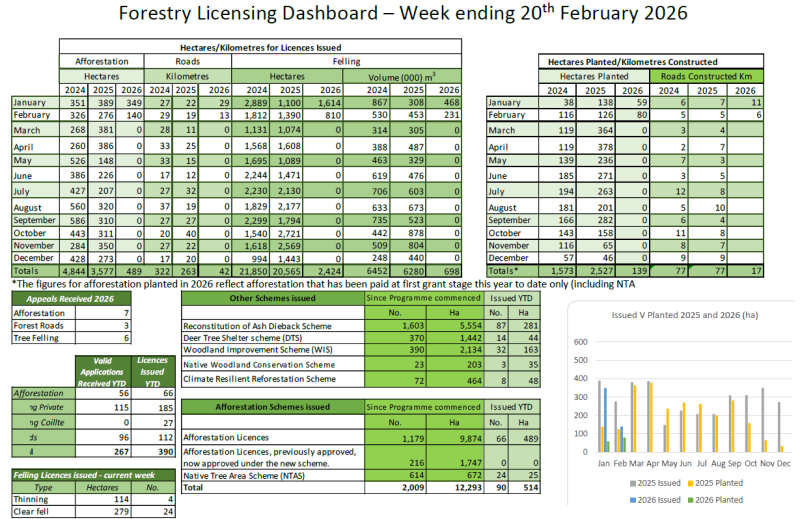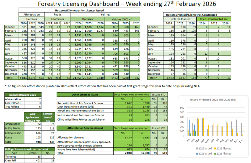 The Forestry Weekly licencing dashboard 2026 shows the details of all forestry licences issued by category on the Department of Agriculture, Food and the Marine website. It is published on the Departmental website and is made available to all interested parties, as well as being submitted to the Joint Committee on Agriculture, Food and the Marine each week.