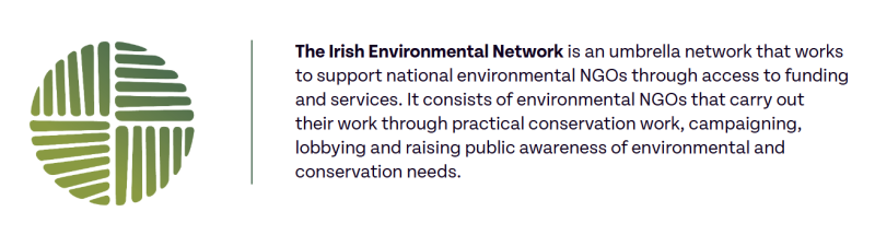 The Irish Environmental Network (IEN) is an umbrella group of environmental Non-Governmental Organisations (NGOs) in Ireland, formed in 2002 to collectively protect and enhance the environment. It works to place environmental issues centrally in national and international discussions, promotes sustainability, and helps member organisations secure funding and services.
